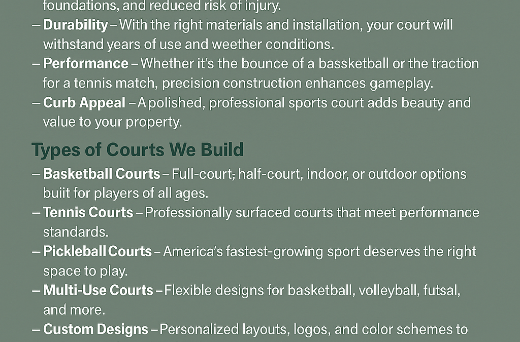 Expert Craftsmanship – We use industry-leading techniques and materials to deliver courts that last.